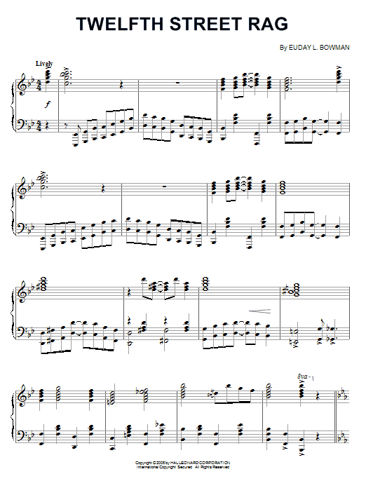 Download or print Euday L. Bowman Twelfth Street Rag sheet music, chords and digital score arranged for Piano Solo. This Jazz score includes 6 page(s).