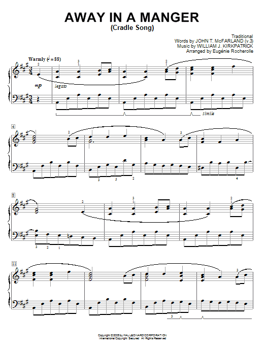 Download or print Eugénie Rocherolle Away In A Manger sheet music, chords and digital score arranged for Piano Solo. This Christian score includes 2 page(s).
