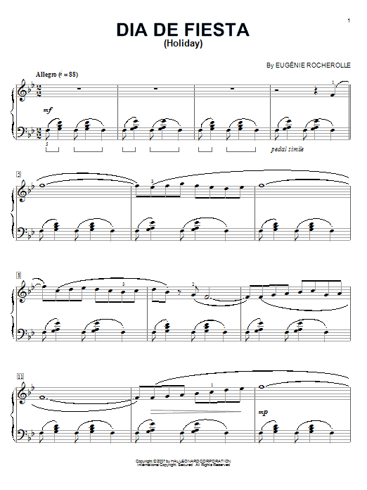 Download or print Eugénie Rocherolle Dia De Fiesta (Holiday) sheet music, chords and digital score arranged for Piano Solo. This Latin score includes 4 page(s).