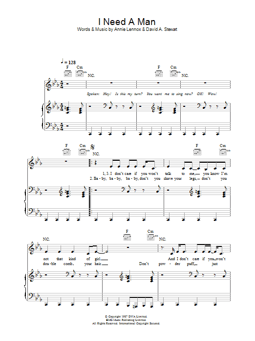 Download or print Eurythmics I Need A Man sheet music, chords and digital score arranged for Guitar Chords/Lyrics. This Rock score includes 3 page(s).