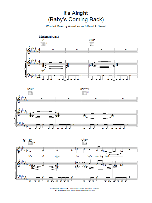 Download or print Eurythmics It's Alright (Baby's Coming Back ) sheet music, chords and digital score arranged for Piano, Vocal & Guitar Chords. This Pop score includes 4 page(s).