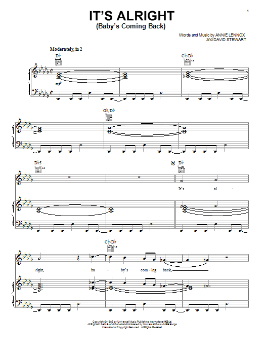 Download or print Eurythmics It's Alright (Baby's Coming Back) sheet music, chords and digital score arranged for Piano, Vocal & Guitar Chords (Right-Hand Melody). This Pop score includes 5 page(s).