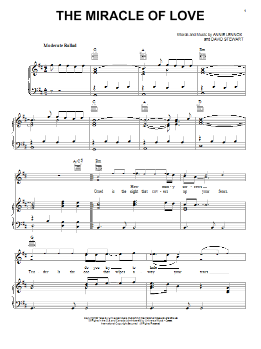 Download or print Eurythmics Miracle Of Love sheet music, chords and digital score arranged for Piano, Vocal & Guitar Chords (Right-Hand Melody). This Pop score includes 4 page(s).