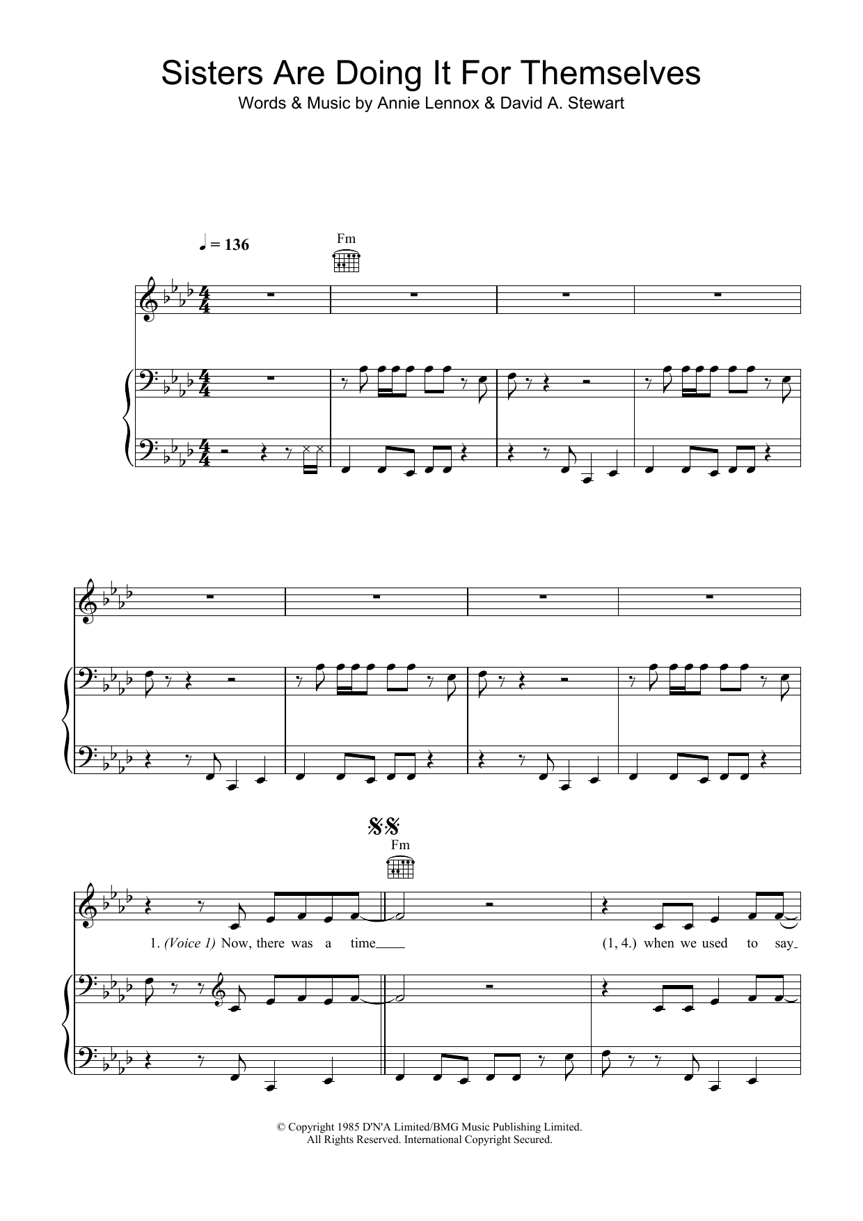 Download or print Eurythmics Sisters Are Doing It For Themselves sheet music, chords and digital score arranged for Piano, Vocal & Guitar Chords. This Pop score includes 6 page(s).