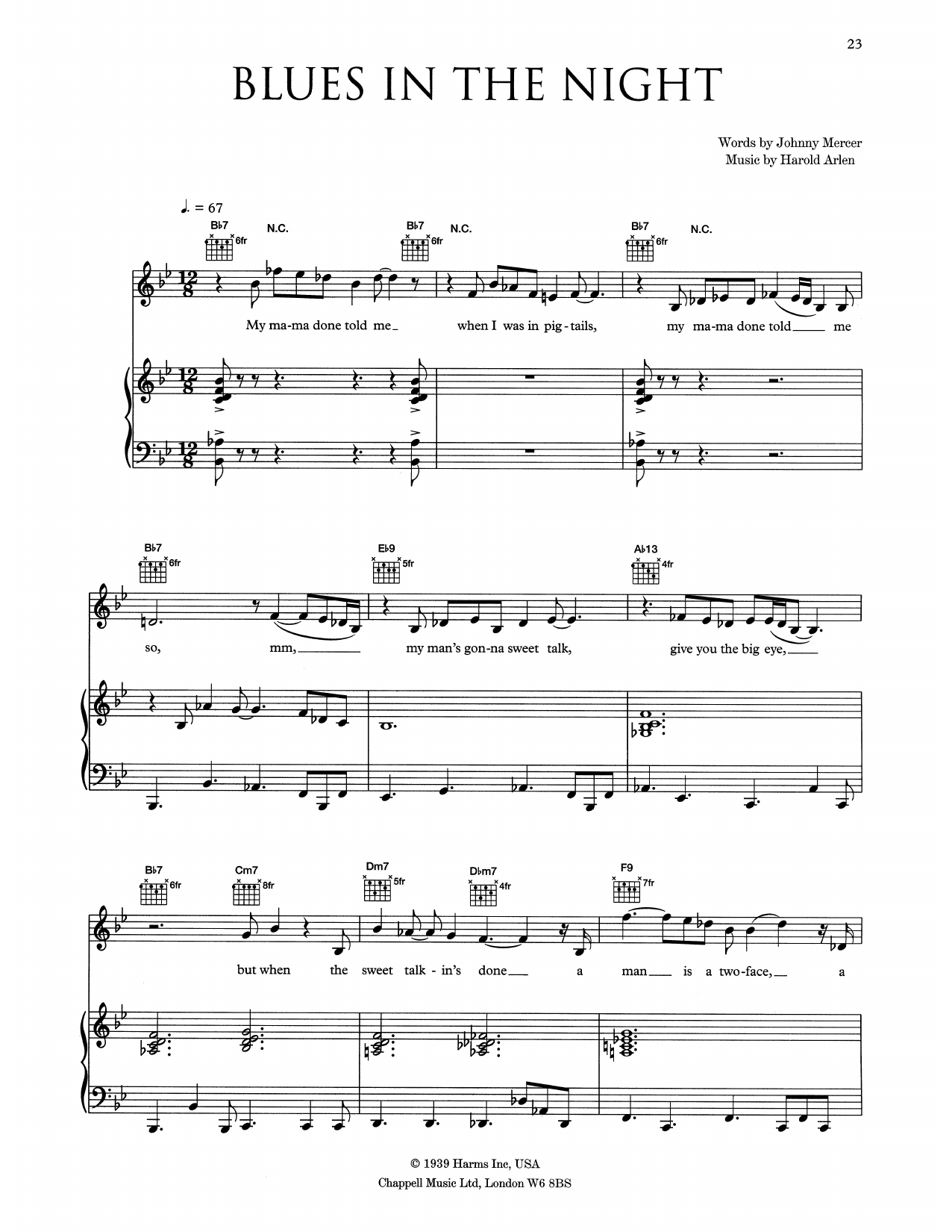 Download or print Eva Cassidy Blues In The Night sheet music, chords and digital score arranged for Piano, Vocal & Guitar Chords (Right-Hand Melody). This Jazz score includes 5 page(s).