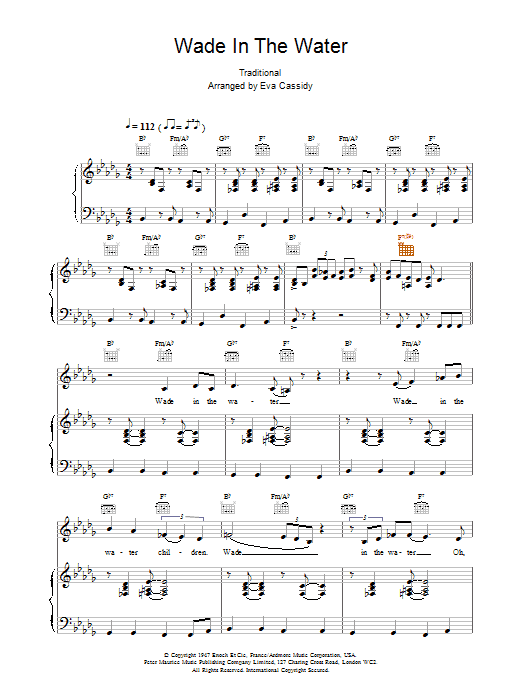 Download or print Eva Cassidy Wade In The Water sheet music, chords and digital score arranged for Piano Solo. This Folk score includes 4 page(s).