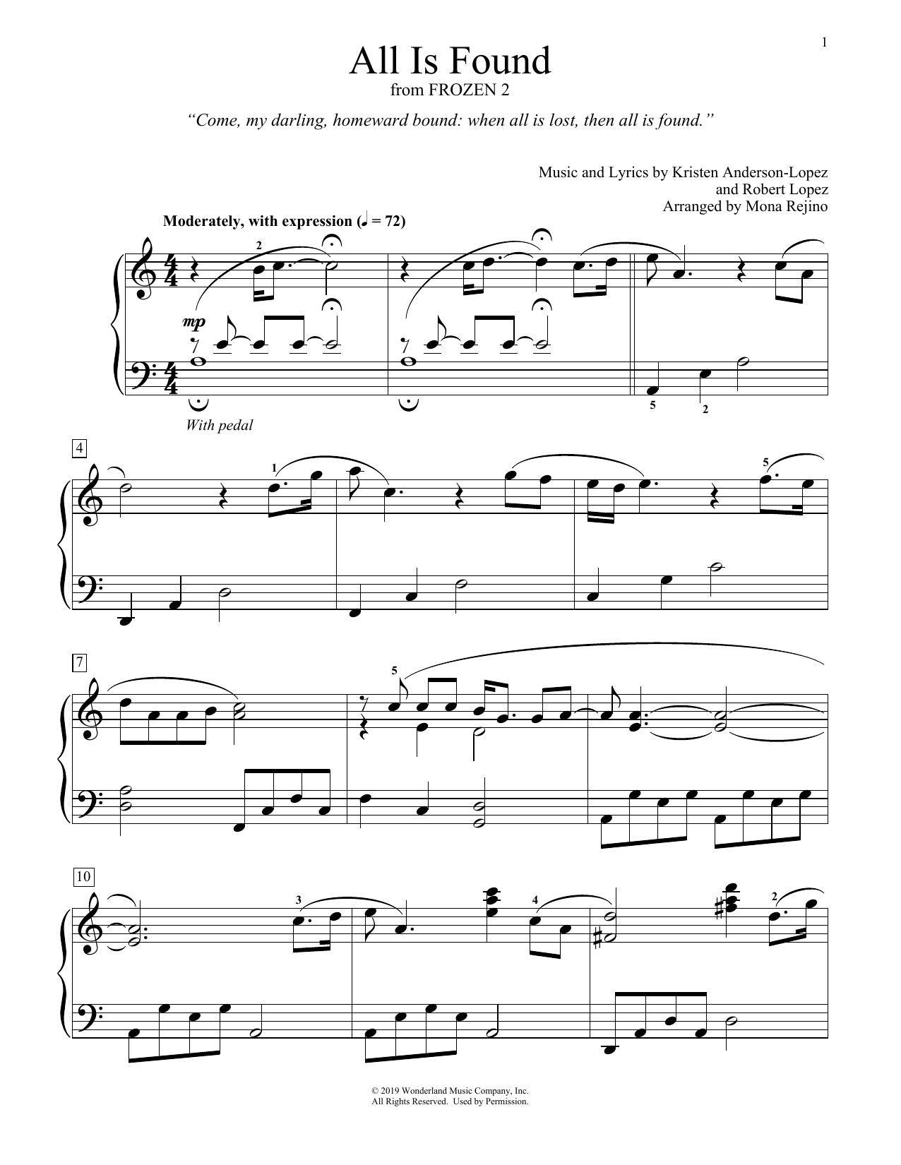 Download or print Evan Rachel Wood All Is Found (from Disney's Frozen 2) (arr. Mona Rejino) sheet music, chords and digital score arranged for Educational Piano. This Disney score includes 3 page(s).