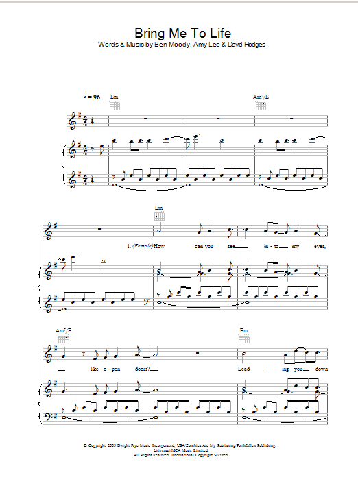 Download or print Evanescence Bring Me To Life sheet music, chords and digital score arranged for Piano, Vocal & Guitar Chords (Right-Hand Melody). This Country score includes 5 page(s).