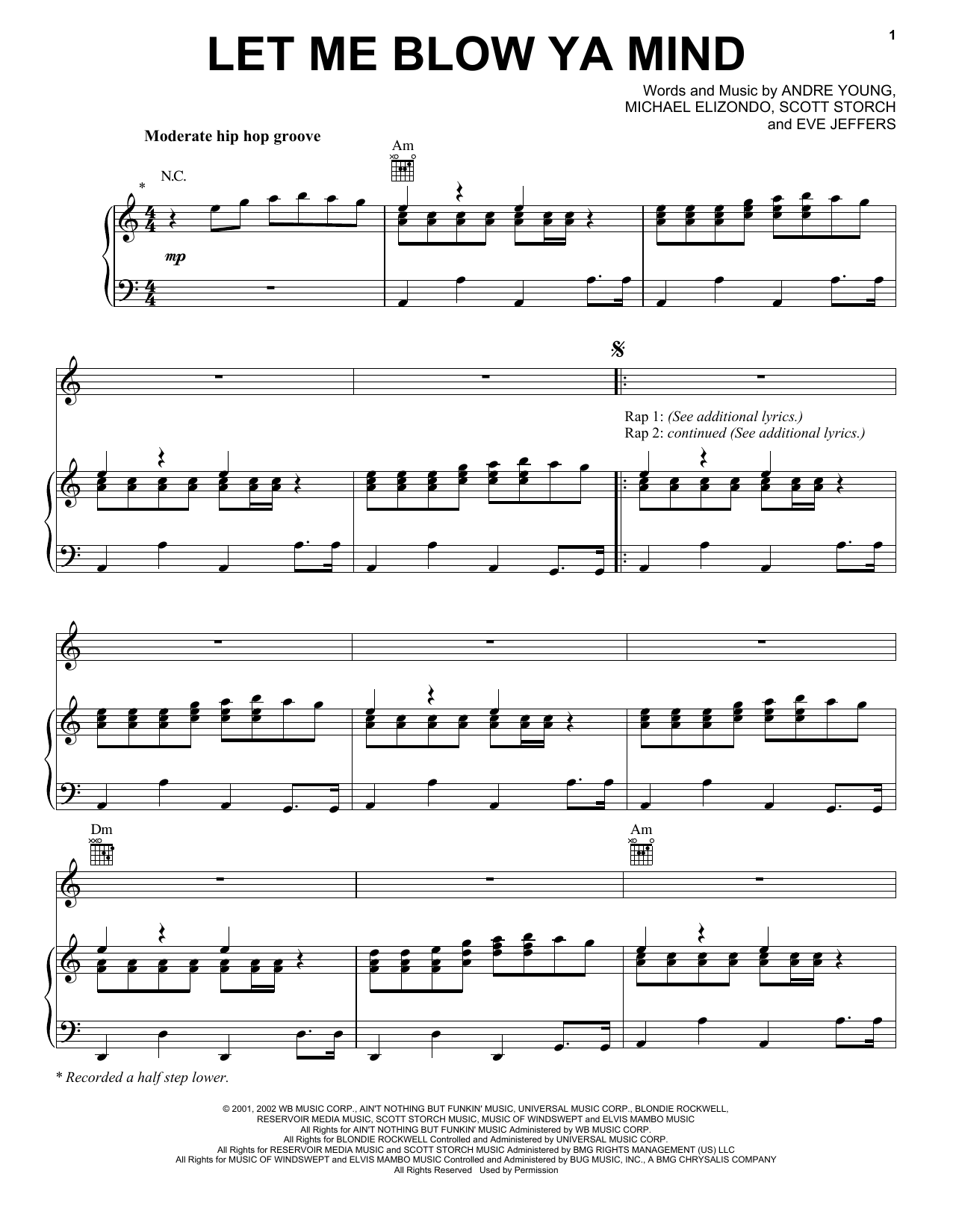 Download or print Eve featuring Gwen Stefani Let Me Blow Ya Mind sheet music, chords and digital score arranged for Piano, Vocal & Guitar Chords (Right-Hand Melody). This Pop score includes 6 page(s).
