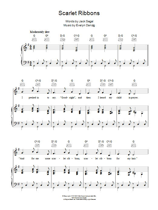 Download or print Evelyn Danzig Scarlet Ribbons sheet music, chords and digital score arranged for Piano, Vocal & Guitar Chords. This Pop score includes 4 page(s).