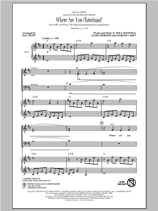 Download or print Faith Hill Where Are You Christmas? (arr. Mac Huff) (from How The Grinch Stole Christmas) sheet music, chords and digital score arranged for SAB Choir. This Christmas score includes 11 page(s).