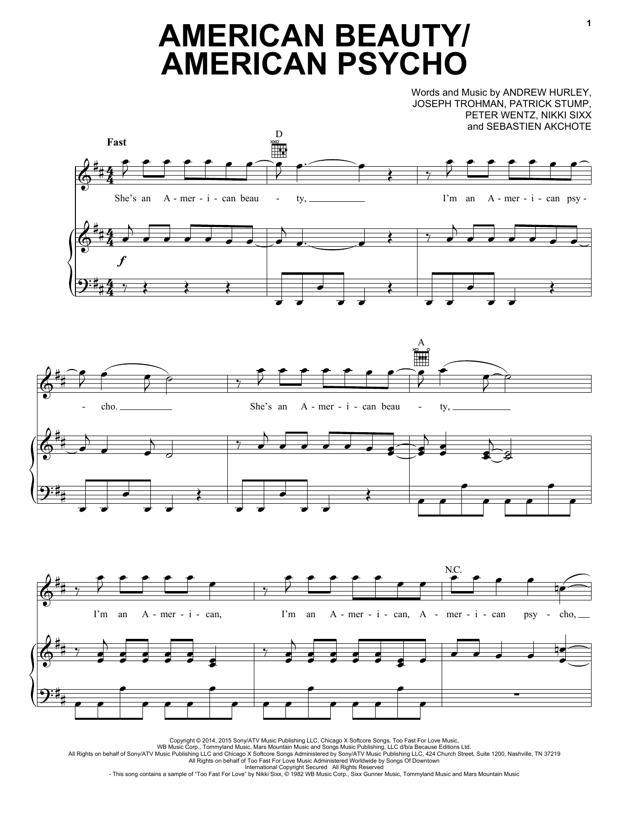 Download or print Fall Out Boy American Beauty/American Psycho sheet music, chords and digital score arranged for Piano, Vocal & Guitar Chords (Right-Hand Melody). This Pop score includes 9 page(s).