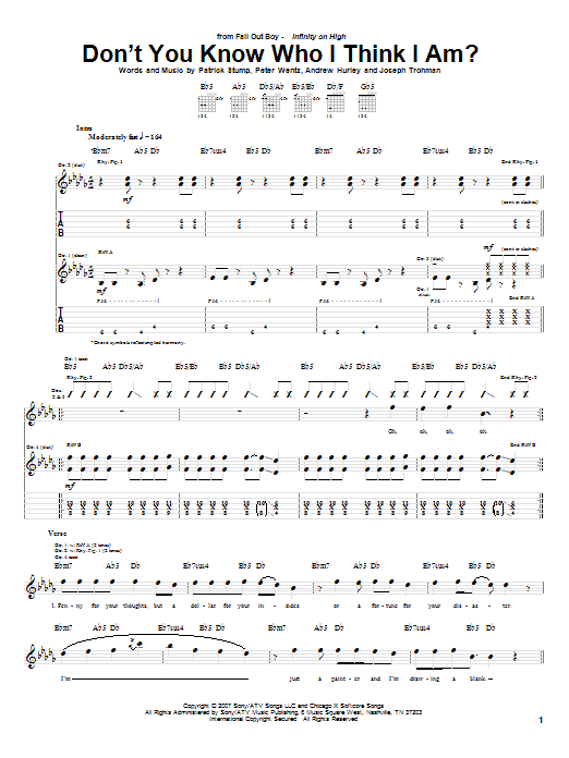 Download or print Fall Out Boy Don't You Know Who I Think I Am? sheet music, chords and digital score arranged for Guitar Tab. This Pop score includes 6 page(s).