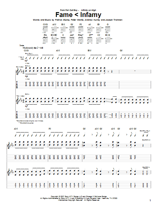Download or print Fall Out Boy Fame < Infamy sheet music, chords and digital score arranged for Guitar Tab. This Pop score includes 8 page(s).
