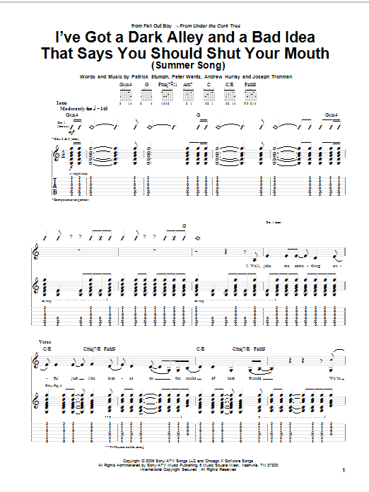 Download or print Fall Out Boy I've Got A Dark Alley And A Bad Idea That Says You Should Shut Your Mouth (Summer Song) sheet music, chords and digital score arranged for Guitar Tab. This Metal score includes 8 page(s).