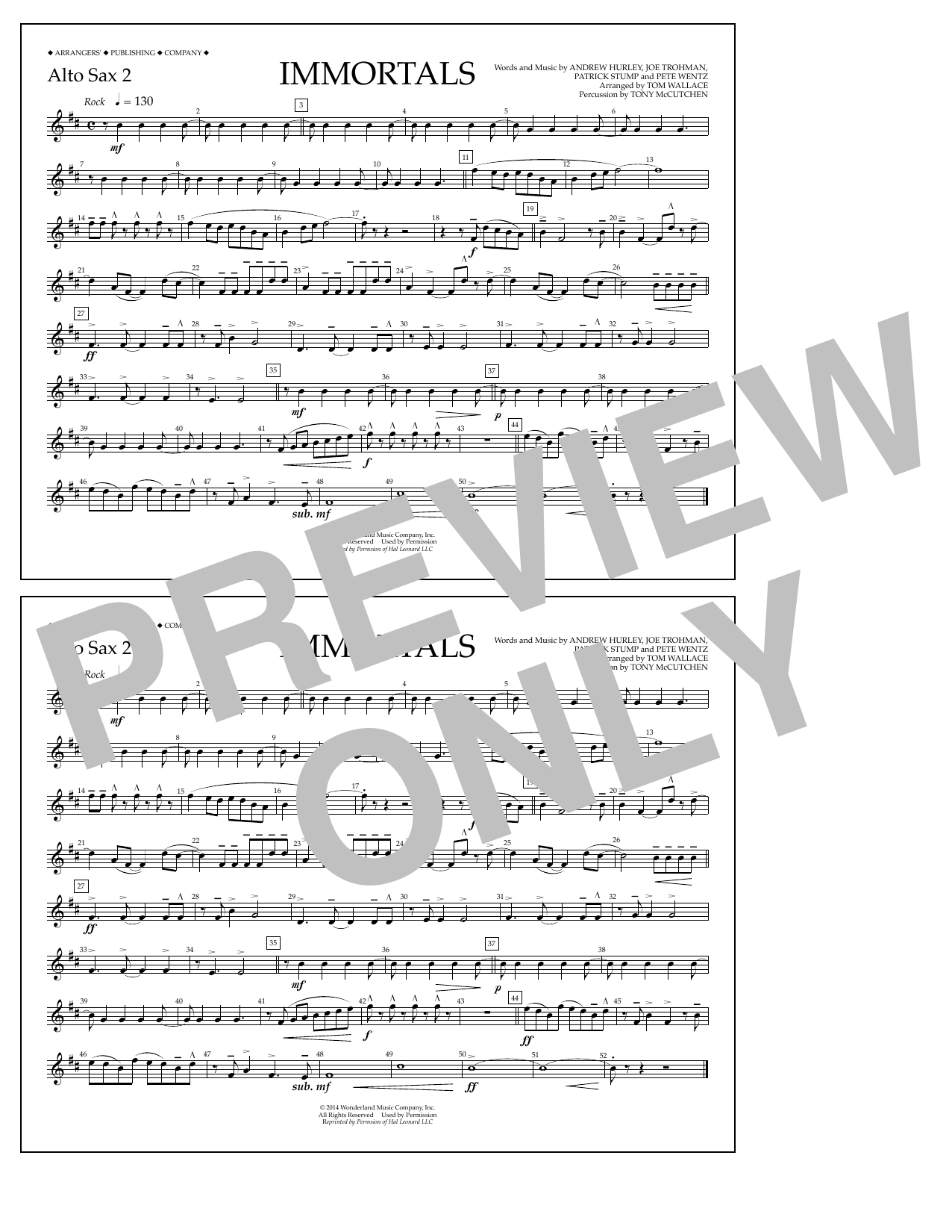 Download or print Fall Out Boy Immortals (from Big Hero 6) (arr. Tom Wallace) - Alto Sax 2 sheet music, chords and digital score arranged for Marching Band. This Disney score includes 1 page(s).