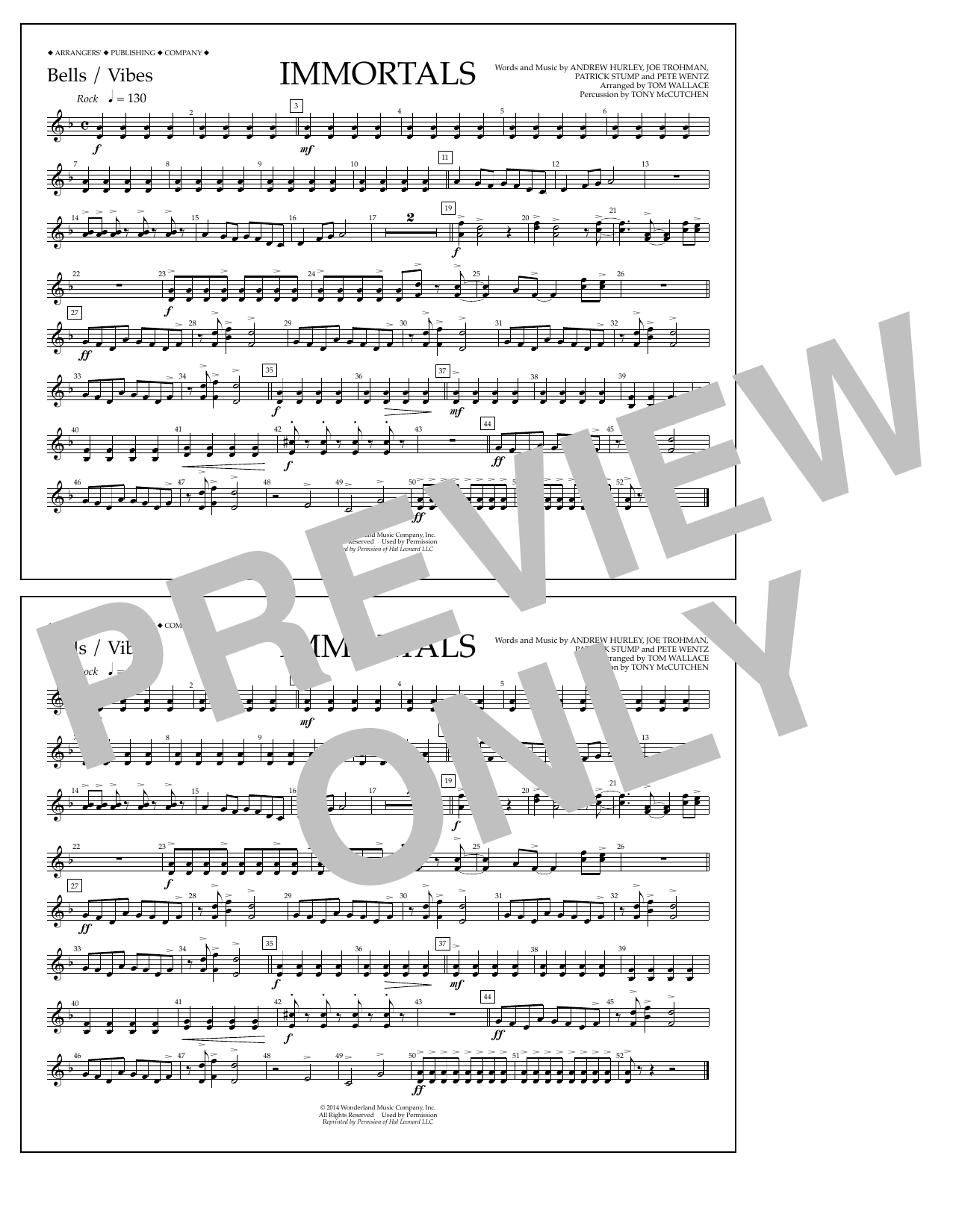 Download or print Fall Out Boy Immortals (from Big Hero 6) (arr. Tom Wallace) - Bells/Vibes sheet music, chords and digital score arranged for Marching Band. This Disney score includes 1 page(s).