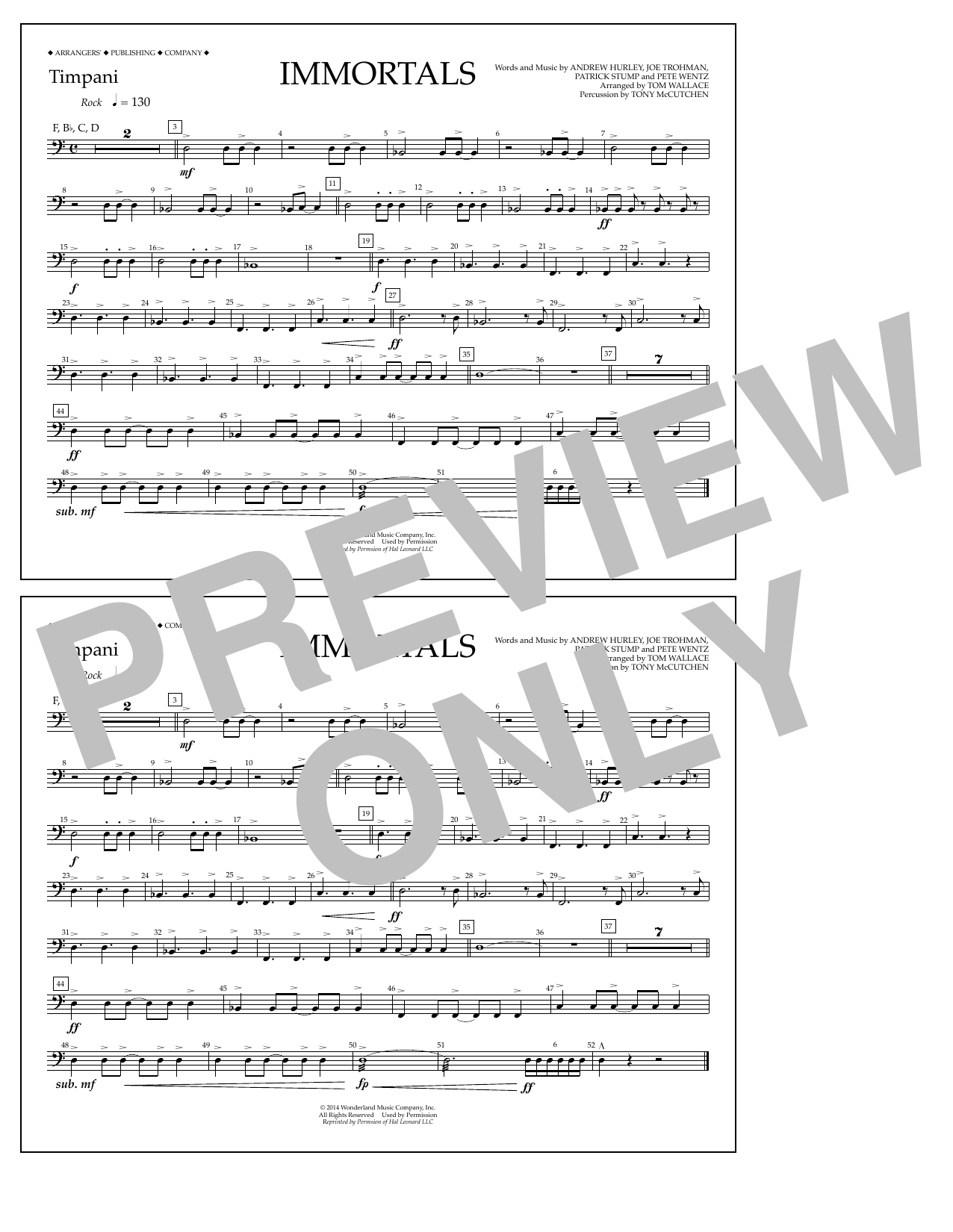 Download or print Fall Out Boy Immortals (from Big Hero 6) (arr. Tom Wallace) - Timpani sheet music, chords and digital score arranged for Marching Band. This Disney score includes 1 page(s).