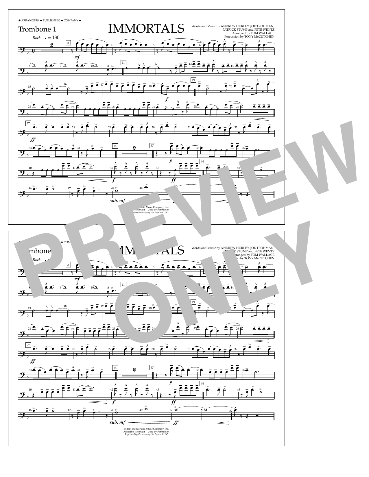 Download or print Fall Out Boy Immortals (from Big Hero 6) (arr. Tom Wallace) - Trombone 1 sheet music, chords and digital score arranged for Marching Band. This Disney score includes 1 page(s).