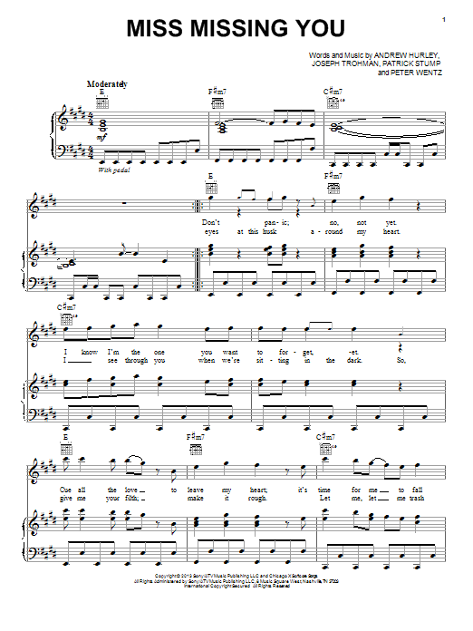 Download or print Fall Out Boy Miss Missing You sheet music, chords and digital score arranged for Piano, Vocal & Guitar Chords (Right-Hand Melody). This Pop score includes 5 page(s).