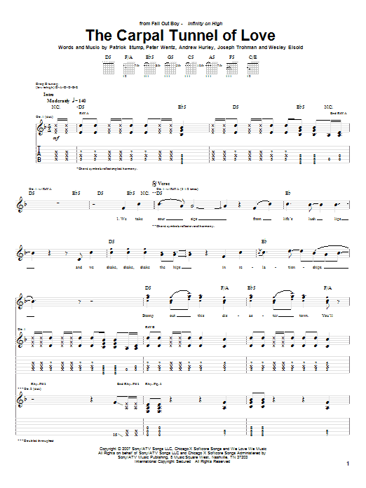 Download or print Fall Out Boy The Carpal Tunnel Of Love sheet music, chords and digital score arranged for Guitar Tab. This Pop score includes 9 page(s).