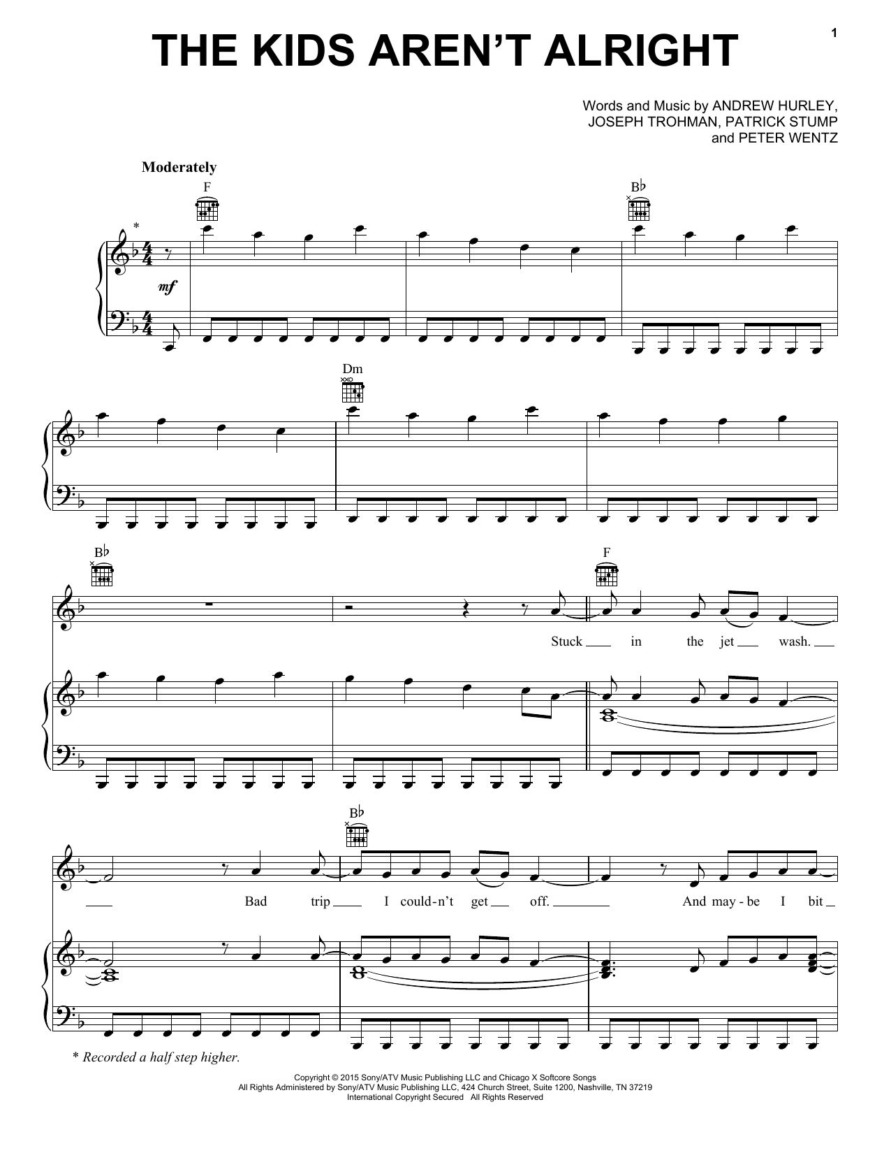 Download or print Fall Out Boy The Kids Aren't Alright sheet music, chords and digital score arranged for Piano, Vocal & Guitar Chords (Right-Hand Melody). This Pop score includes 9 page(s).