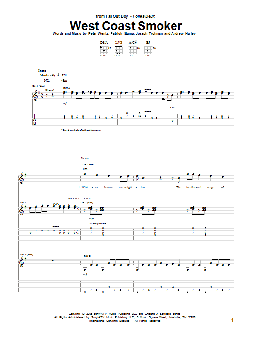Download or print Fall Out Boy West Coast Smoker sheet music, chords and digital score arranged for Guitar Tab. This Pop score includes 8 page(s).
