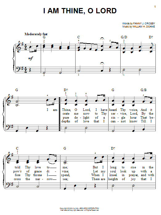 Download or print Fanny J. Crosby I Am Thine, O Lord sheet music, chords and digital score arranged for Easy Piano. This Christian score includes 2 page(s).