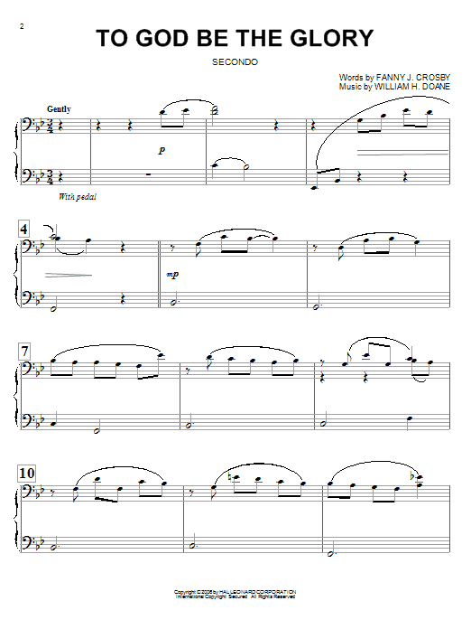 Download or print Fanny J. Crosby To God Be The Glory sheet music, chords and digital score arranged for Big Note Piano. This Christian score includes 3 page(s).