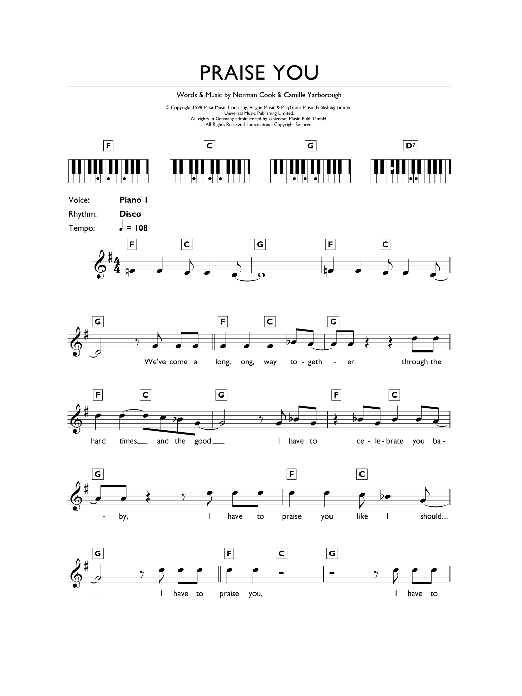 Download or print Fat Boy Slim Praise You sheet music, chords and digital score arranged for Piano Chords/Lyrics. This Pop score includes 2 page(s).