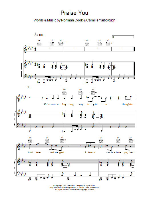 Download or print Fatboy Slim Praise You sheet music, chords and digital score arranged for Piano Chords/Lyrics. This Pop score includes 2 page(s).
