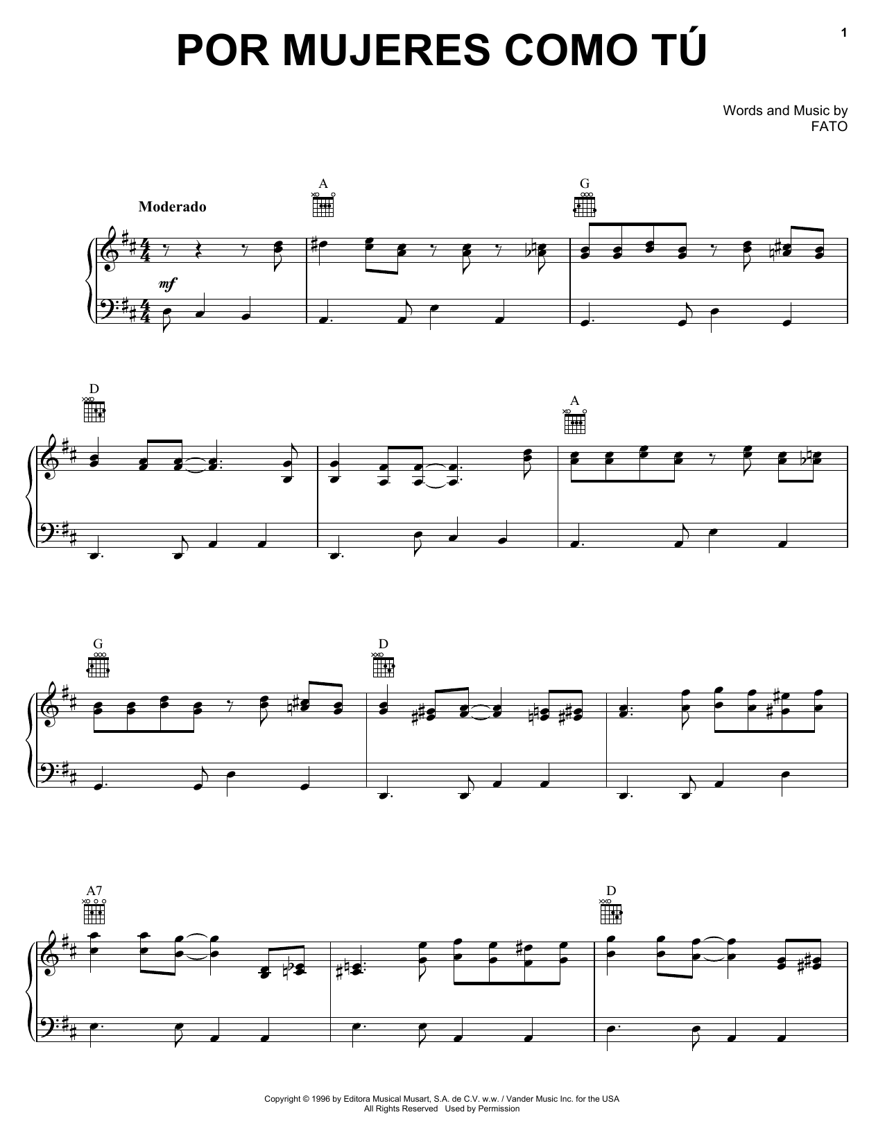 Download or print FATO Por Mujeres Como Tu sheet music, chords and digital score arranged for Piano, Vocal & Guitar Chords (Right-Hand Melody). This Latin score includes 8 page(s).