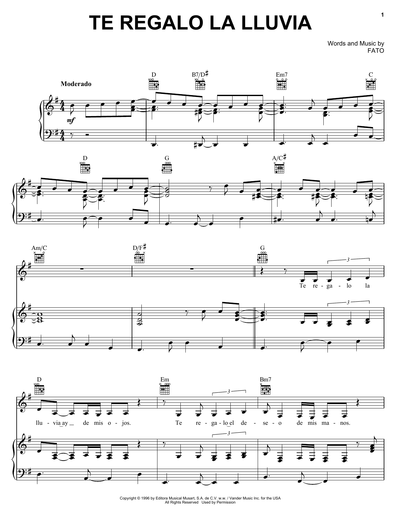 Download or print FATO Te Regalo La Lluvia sheet music, chords and digital score arranged for Piano, Vocal & Guitar Chords (Right-Hand Melody). This Latin score includes 6 page(s).