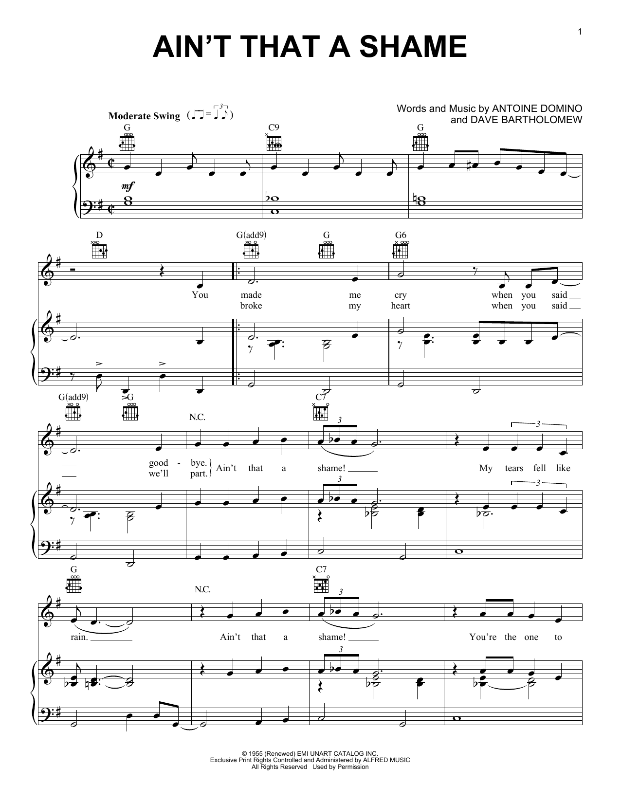Download or print Fats Domino Ain't That A Shame sheet music, chords and digital score arranged for Very Easy Piano. This Blues score includes 2 page(s).