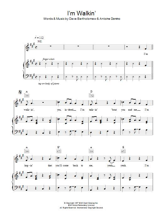 Download or print Antoine 'Fats' Domino I'm Walkin' sheet music, chords and digital score arranged for Piano, Vocal & Guitar Chords. This Rock score includes 5 page(s).
