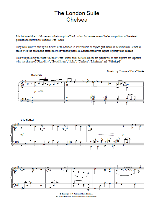 Download or print Fats Waller Chelsea (from The London Suite) sheet music, chords and digital score arranged for Piano Solo. This Jazz score includes 4 page(s).