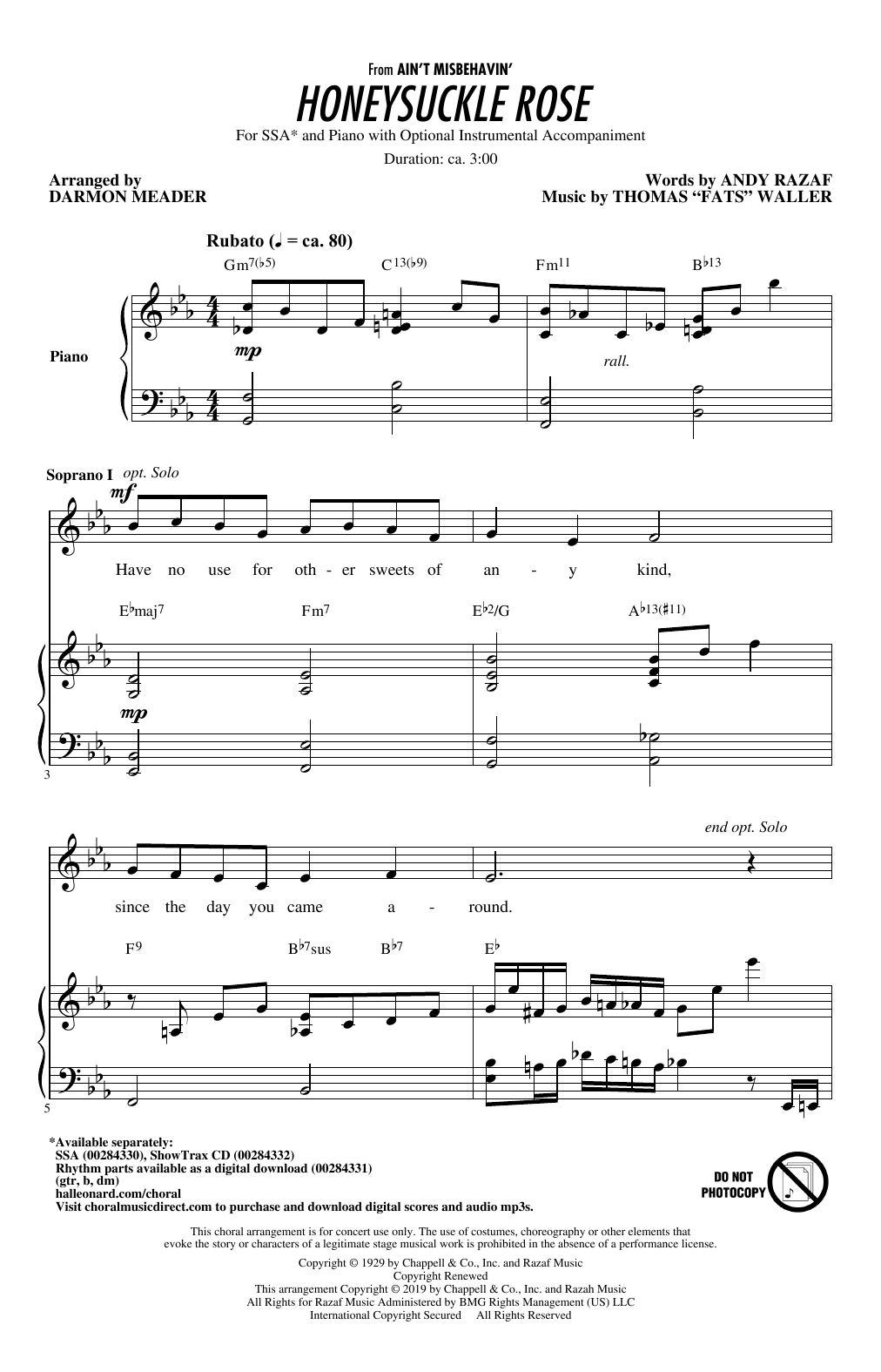 Download or print Fats Waller Honeysuckle Rose (arr. Darmon Meader) sheet music, chords and digital score arranged for SSA Choir. This Jazz score includes 14 page(s).