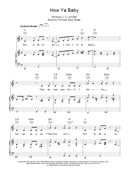 Download or print Fats Waller How Ya Baby sheet music, chords and digital score arranged for Piano, Vocal & Guitar Chords. This Jazz score includes 4 page(s).