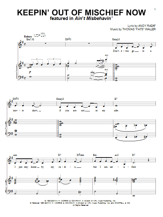 Download or print Fats Waller Keepin' Out Of Mischief Now sheet music, chords and digital score arranged for Piano Solo. This Jazz score includes 6 page(s).
