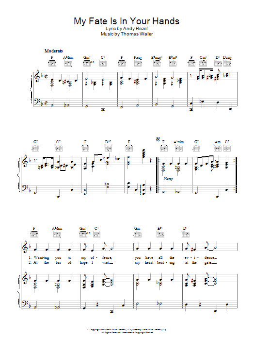 Download or print Fats Waller My Fate Is In Your Hands sheet music, chords and digital score arranged for Piano, Vocal & Guitar Chords. This Blues score includes 5 page(s).