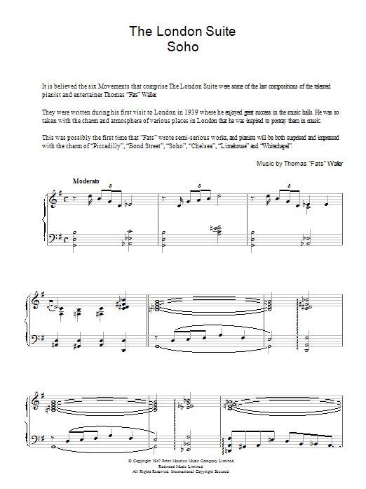 Download or print Fats Waller Soho (from The London Suite) sheet music, chords and digital score arranged for Piano Solo. This Jazz score includes 5 page(s).