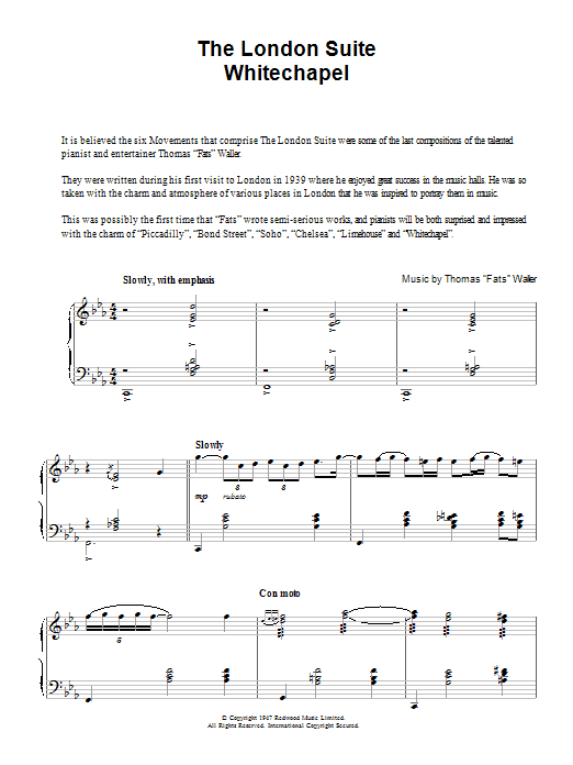 Download or print Fats Waller Whitechapel (from The London Suite) sheet music, chords and digital score arranged for Piano Solo. This Jazz score includes 5 page(s).