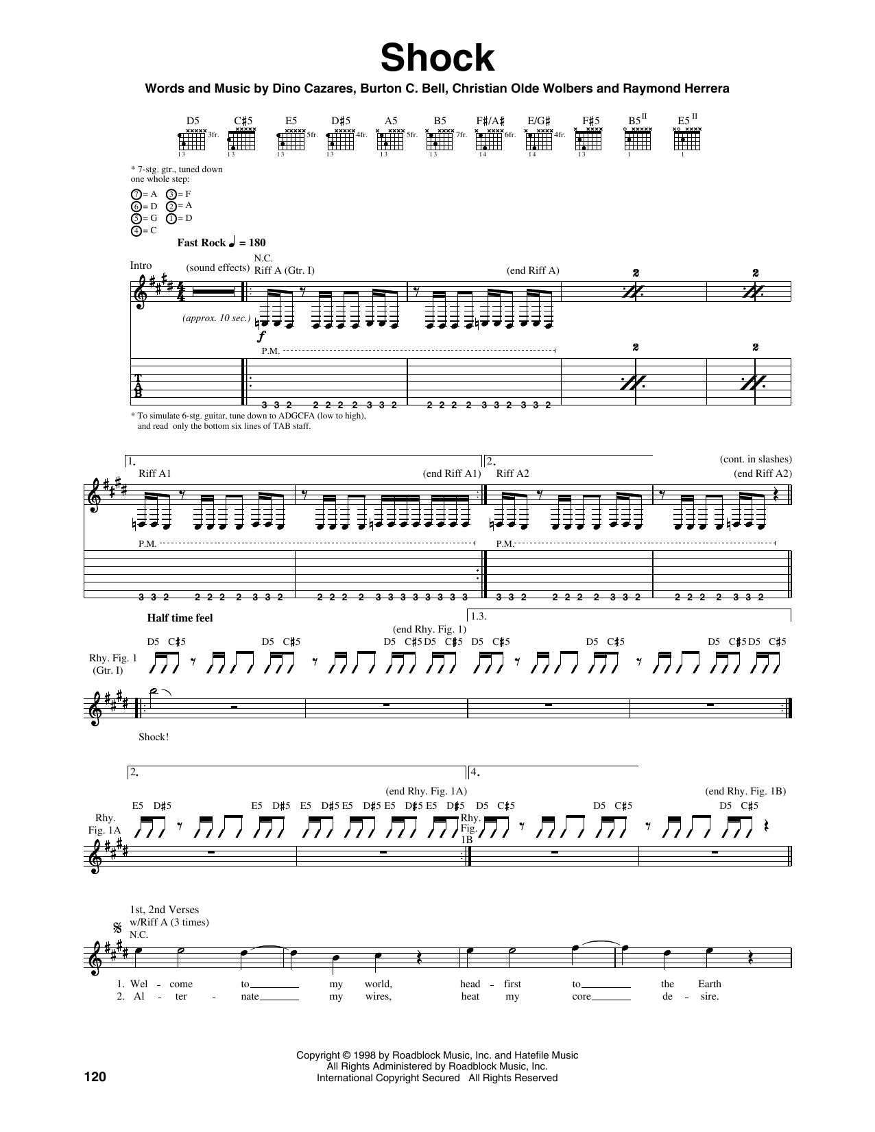 Download or print Fear Factory Shock sheet music, chords and digital score arranged for Guitar Tab. This Rock score includes 5 page(s).