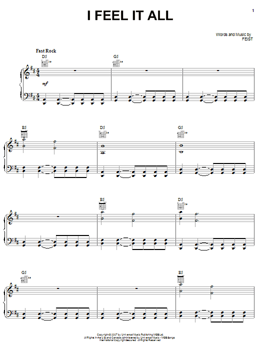 Download or print Feist I Feel It All sheet music, chords and digital score arranged for Piano, Vocal & Guitar Chords (Right-Hand Melody). This Pop score includes 9 page(s).