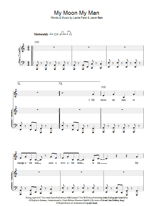 Download or print Feist My Moon My Man sheet music, chords and digital score arranged for Piano, Vocal & Guitar Chords (Right-Hand Melody). This Pop score includes 5 page(s).