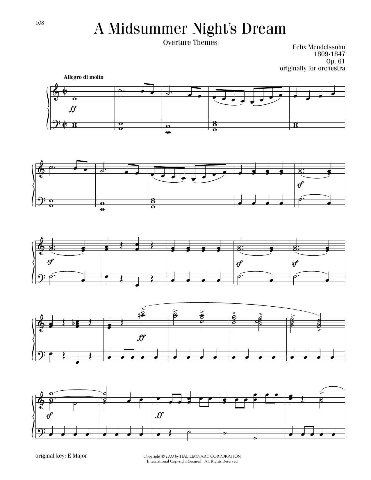 Download or print Felix Mendelssohn A Midsummer Night's Dream Overture, Excerpt sheet music, chords and digital score arranged for Piano Solo. This Classical score includes 7 page(s).