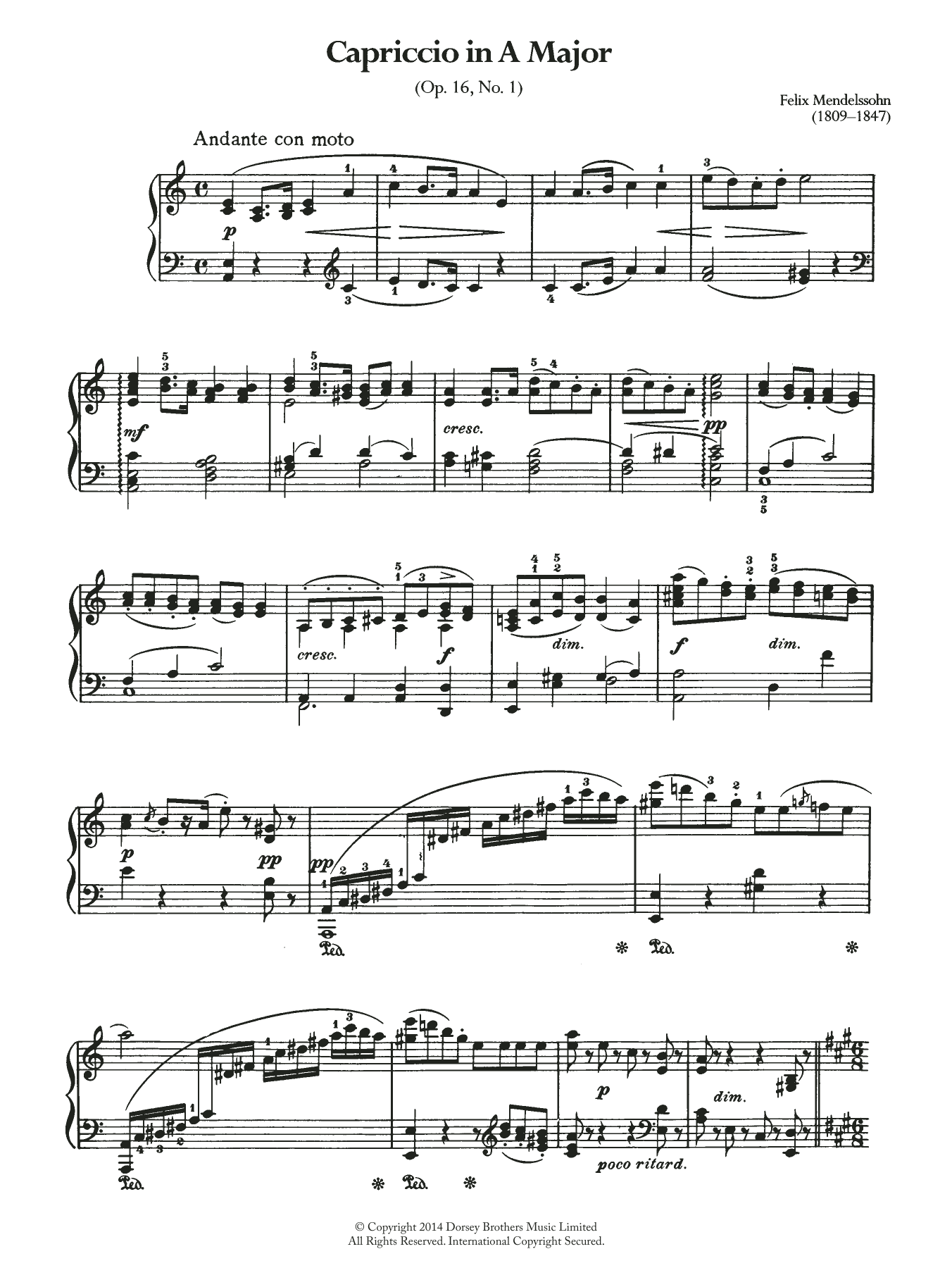 Download or print Felix Mendelssohn Capriccio In A Major sheet music, chords and digital score arranged for Piano Solo. This Classical score includes 4 page(s).