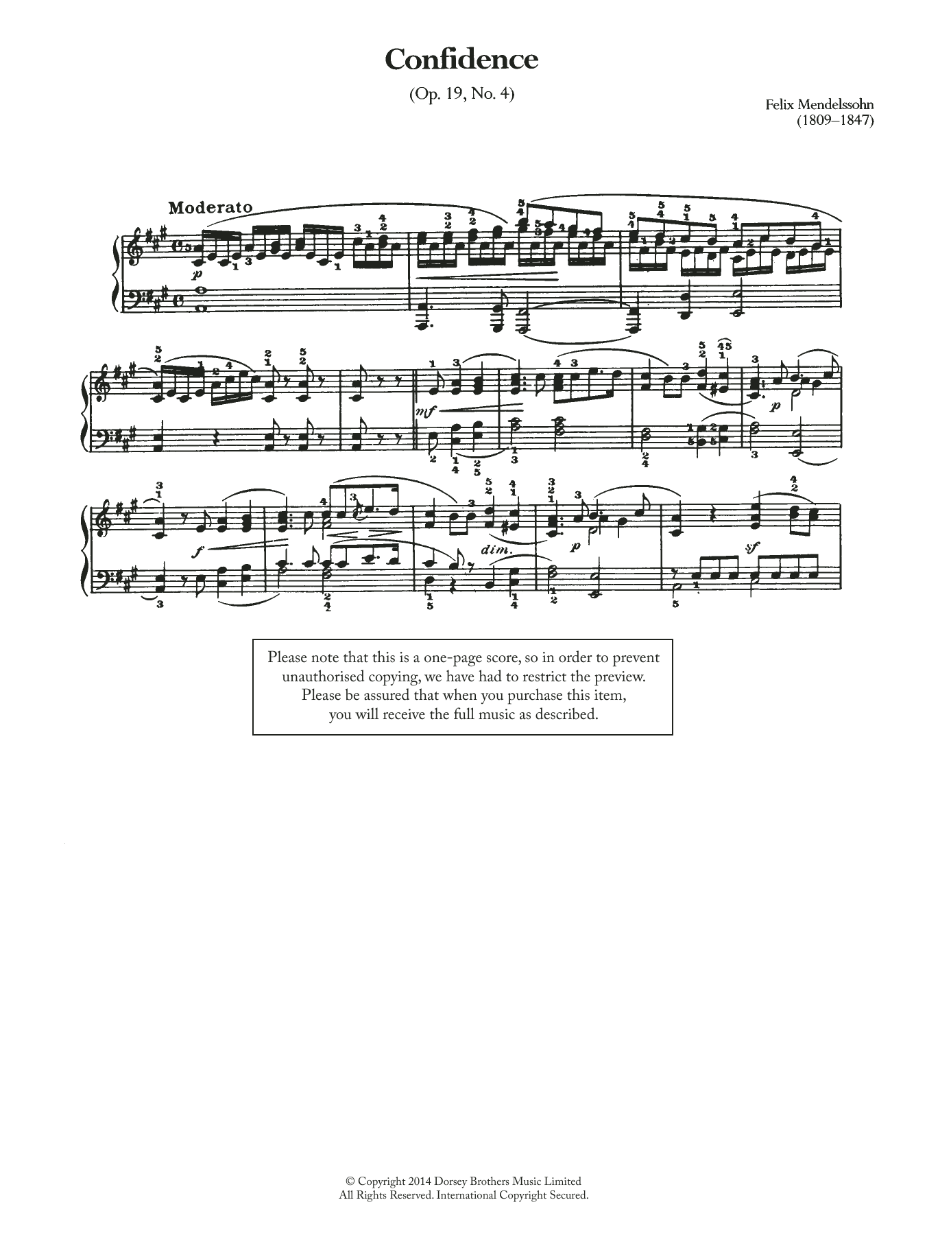 Download or print Felix Mendelssohn Confidence Op.19, No.4 sheet music, chords and digital score arranged for Piano Solo. This Classical score includes 2 page(s).