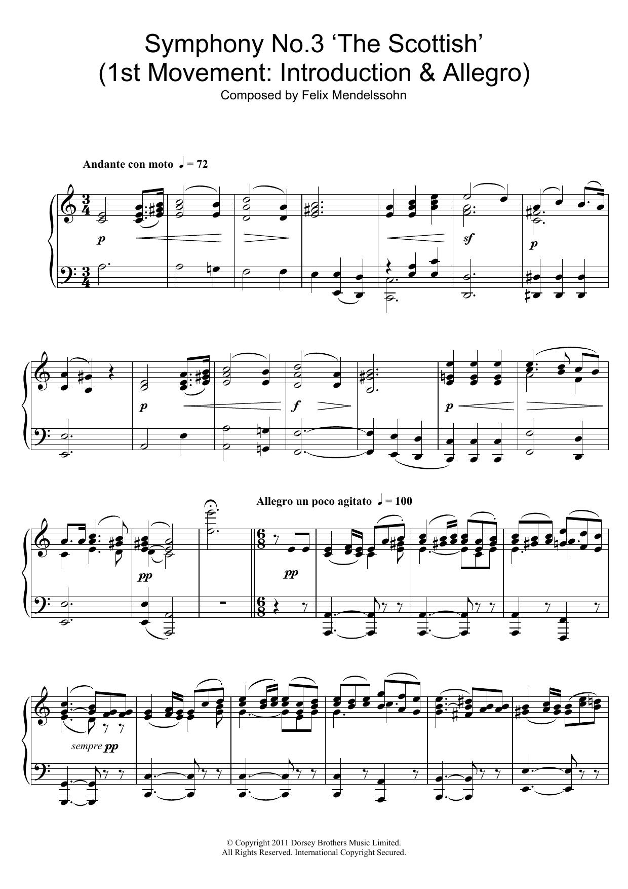 Download or print Felix Mendelssohn Symphony No.3 'The Scottish' (1st Movement: Introduction and Allegro) sheet music, chords and digital score arranged for Piano Solo. This Classical score includes 3 page(s).