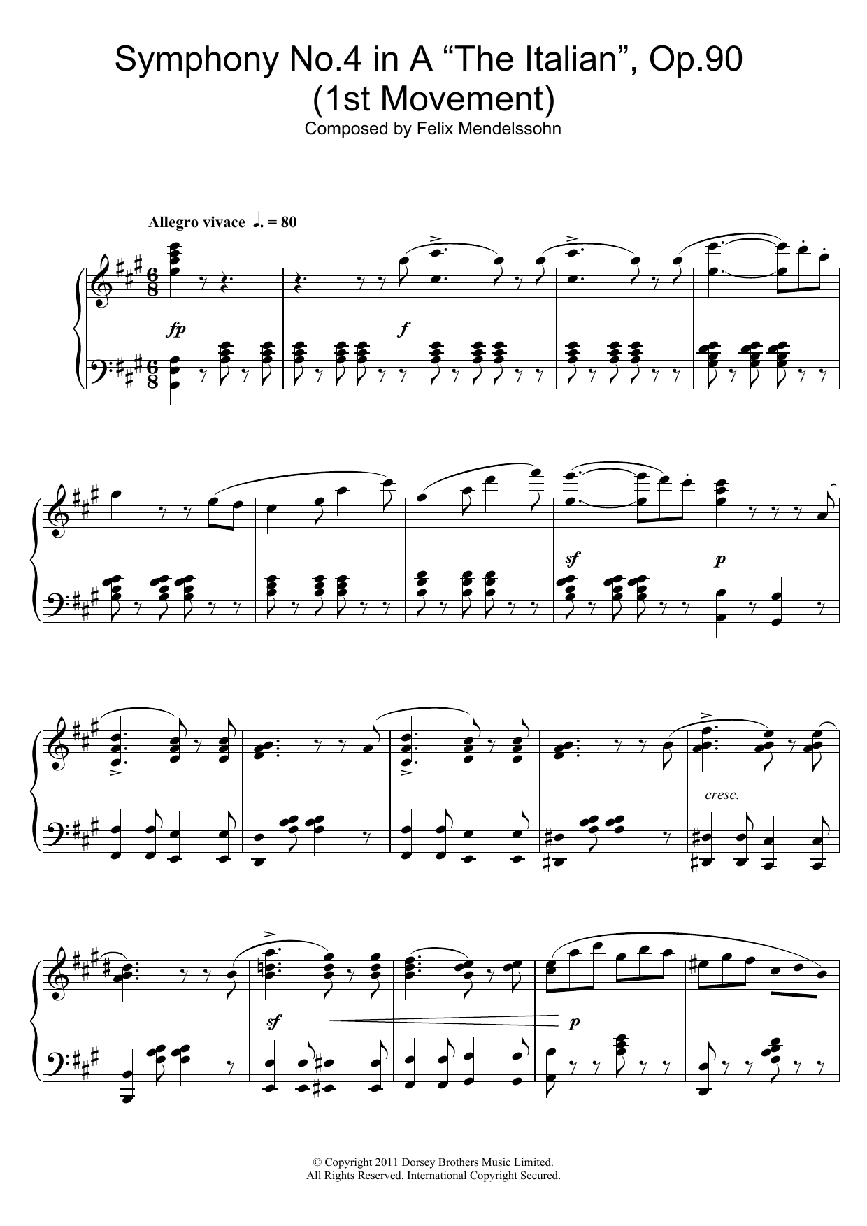 Download or print Felix Mendelssohn Symphony No.4 'The Italian' (1st Movement: Allegro Vivace) sheet music, chords and digital score arranged for Piano Solo. This Classical score includes 3 page(s).
